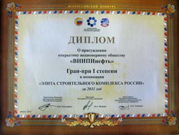 7 августа 2012 года в Государственной академии специалистов инвестиционной сферы (ГАСИС) состоялось торжественное награждение победителей VIII Всероссийского конкурса на лучшую проектную и изыскательскую организацию и фирму аналогичного профиля за 2011 год. В соответствии с решением конкурсной Комиссии совместного заседания Министерства регионального развития Российской Федерации, Российского Союза строителей и Профсоюза работников строительства и промышленности строительных материалов ОАО «ВНИПИнефть» награждено Дипломом, подтверждающим присвоение звания «ЭЛИТА СТРОИТЕЛЬНОГО КОМПЛЕКСА РОССИИ» и Кубком Гран-при I степени. Генеральный директор института, Капустин Владимир Михайлович с благодарностью принял награды от Яковлева Владимира Анатольевича, Президента ОМОР (Общероссийское межотраслевое объединение работодателей), Беляева Дмитрия Владимировича, исполняющего обязанности директора Департамента Министерства регионального развития РФ и Сошенко Бориса Александровича, председателя Профсоюза работников строительства и промышленности строительных материалов. ______________________________ Награждение в Министерстве регионального развития Российской ФедерацииВ Минрегионе России состоялась церемония награждения победителей VI Международного конкурса на лучшую строительную и проектную организацию, предприятие строительных материалов и стройиндустрии стран СНГ за 2010 год, а также XV Всероссийского конкурса на лучшую строительную организацию, предприятие строительных материалов и стройиндустрии за 2010 год и VII Всероссийского Конкурса на лучшую проектную, изыскательскую организацию и фирму аналогичного профиля за 2010 год. В церемонии награждения приняли участие президент Российского союза строителей Владимир Яковлев и председатель Профсоюза работников строительства и промышленности строительных материалов Российской Федерации Борис Сошенко. Награждение победителей провел Заместитель Министра регионального развития Российской Федерации Анатолий Попов. В приветственном слове Анатолий Попов отметил вклад работников строительной отрасли в развитие российской экономики и выразил уверенность в укреплении взаимовыгодного партнерства в строительной сфере со странами СНГ. Заместитель министра также подчеркнул важную социальную роль, выполняемую работниками строительной отрасли. ОАО «ВНИПИнефть» признано Лауреатом VII Всероссийского Конкурса на лучшую проектную и изыскательскую организацию за 2010 год и 4 августа 2011 года было награждено дипломами «Элита строительного комплекса России» и «Лидер строительного комплекса России», а также уже традиционно возглавило рейтинг 100 лучших проектных и изыскательных организаций. В рамках Конкурса Генеральный Директор ОАО «ВНИПИнефть» Капустин В.М. был признан лучшим руководителем проектной и изыскательской организации в 2010 году. Победителями VII Всероссийского Конкурса также стали 61 организация из тридцати девяти субъектов Российской Федерации.